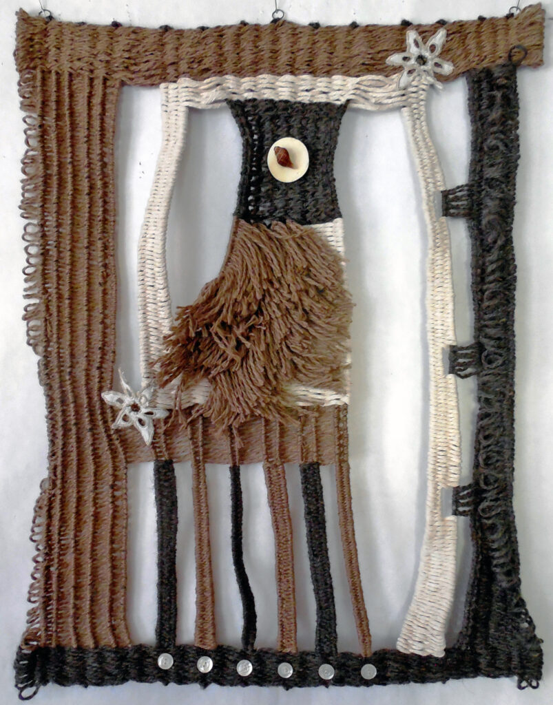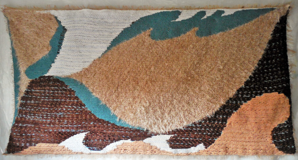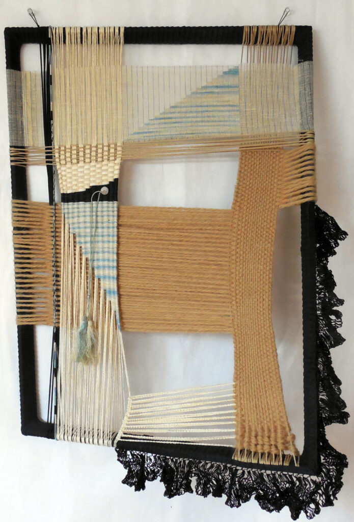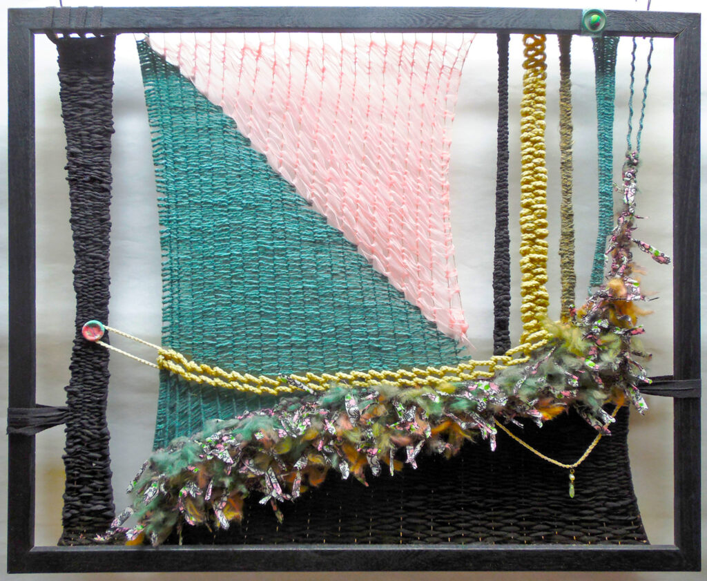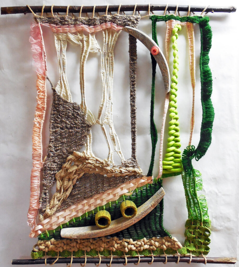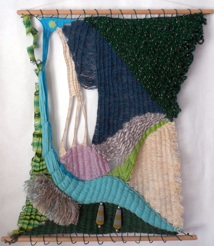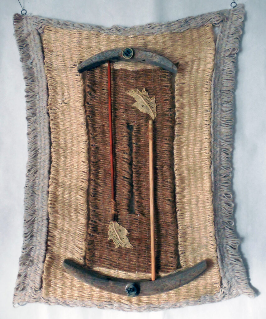 large (36×68″) weaving on loose garden mesh, with a solid fabric backing and a supporting wood hanger