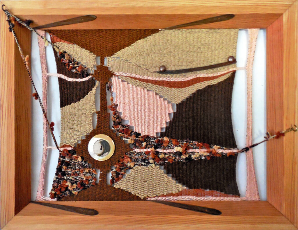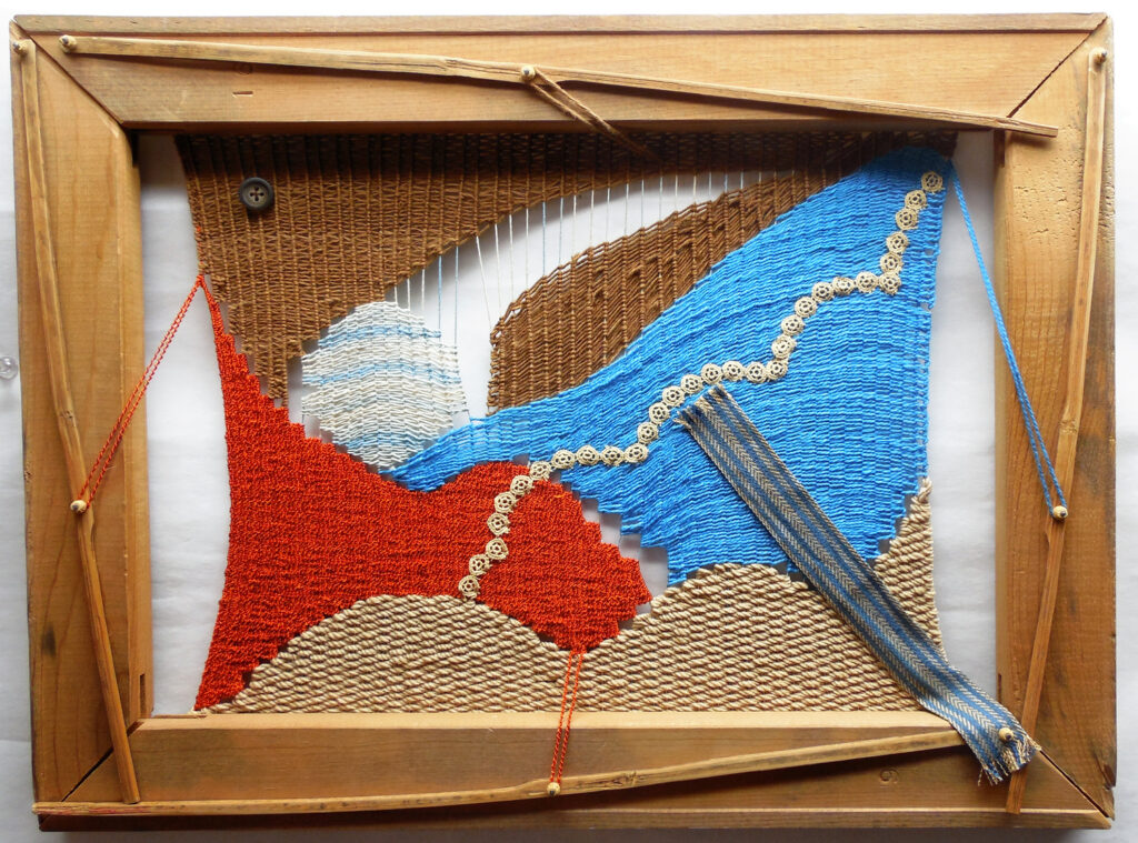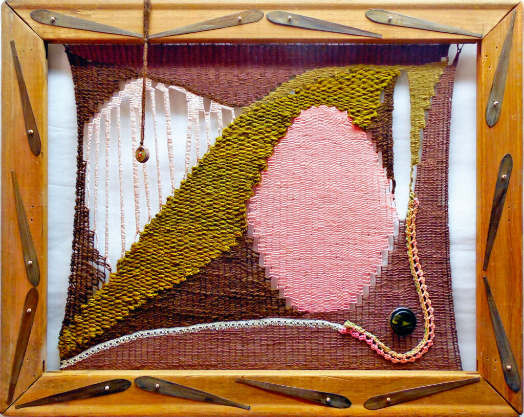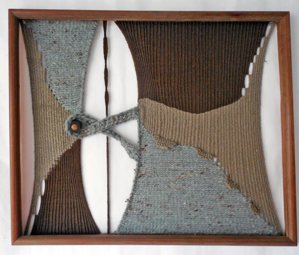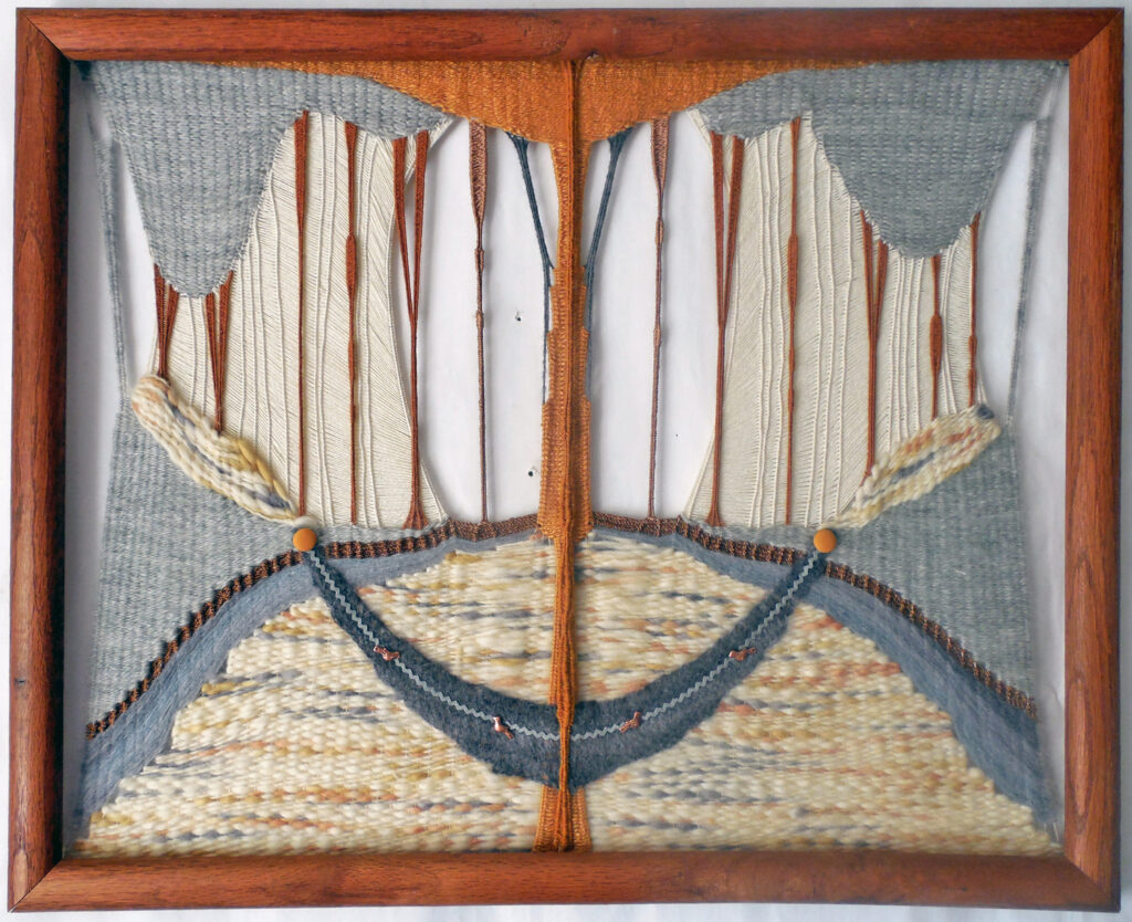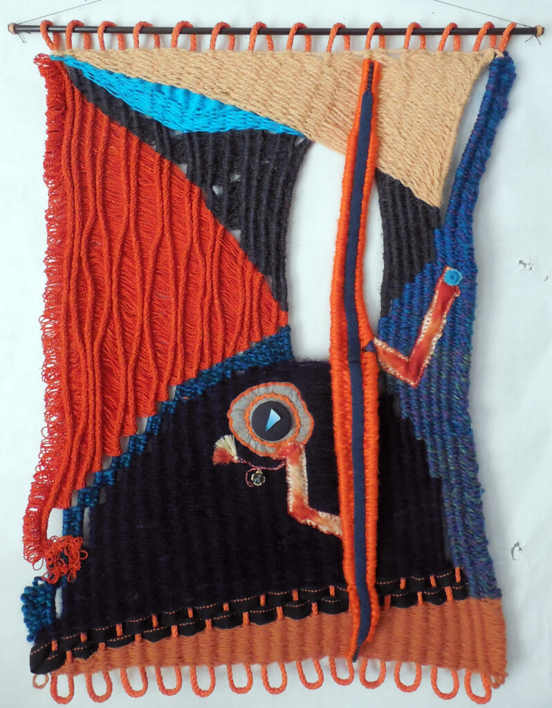large (36×68″) weaving on loose garden mesh, with a solid fabric backing and a supporting wood hanger