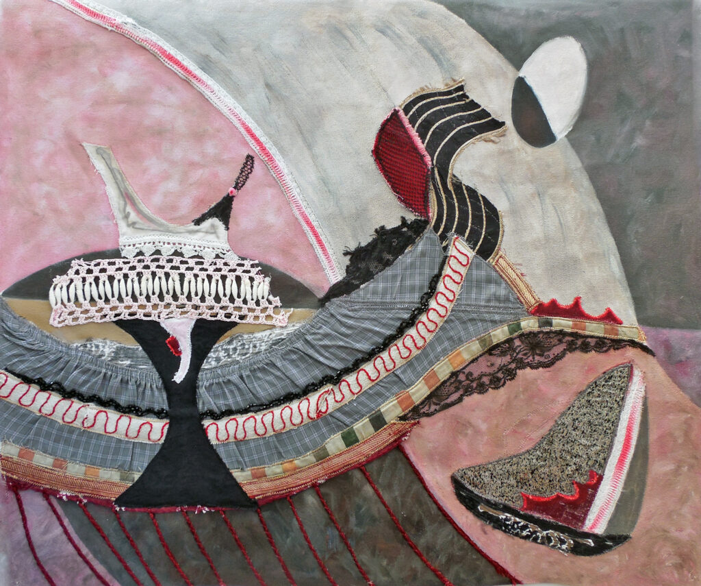 the impulse of desire (2022) – oil, collage + appliqué on canvas