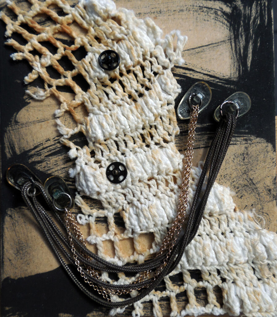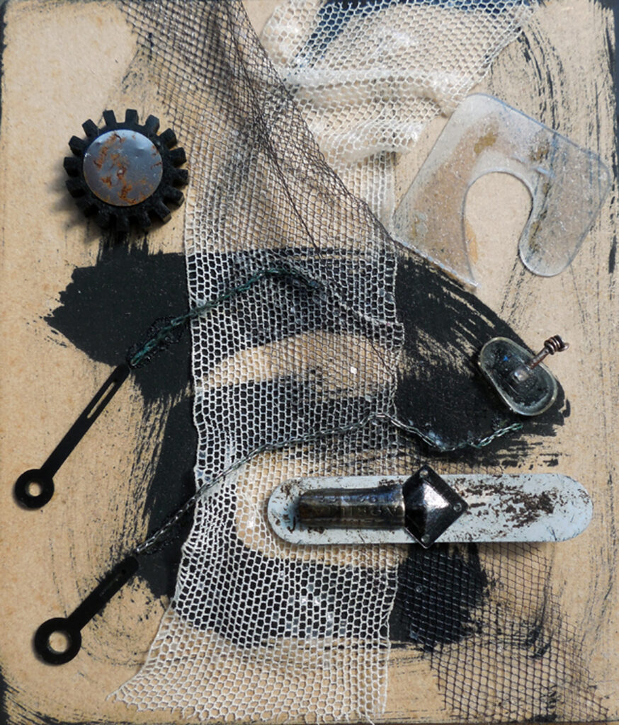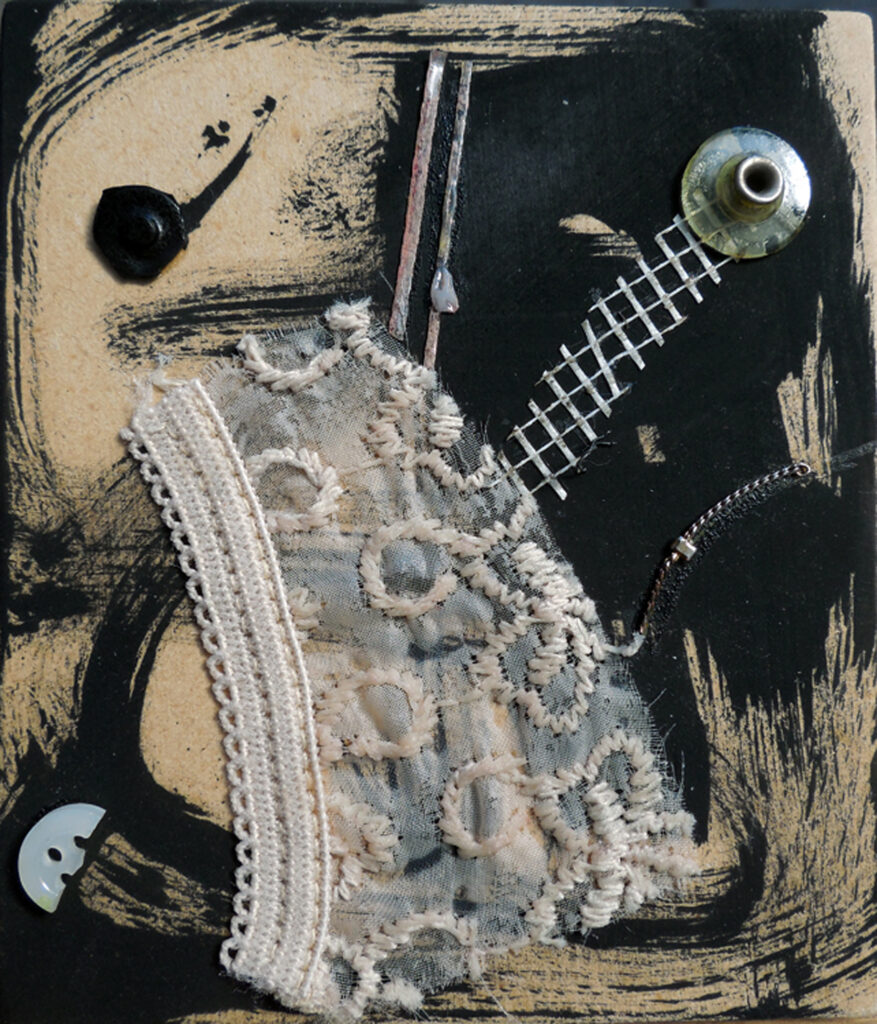 intimacy (2020) – ink, collage + assemblage on masonite